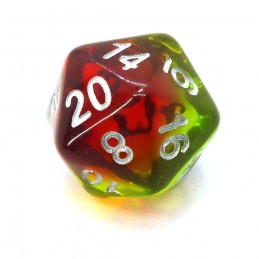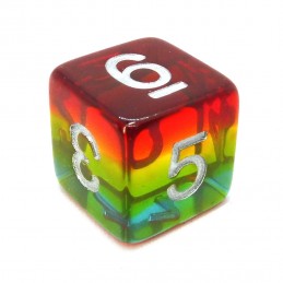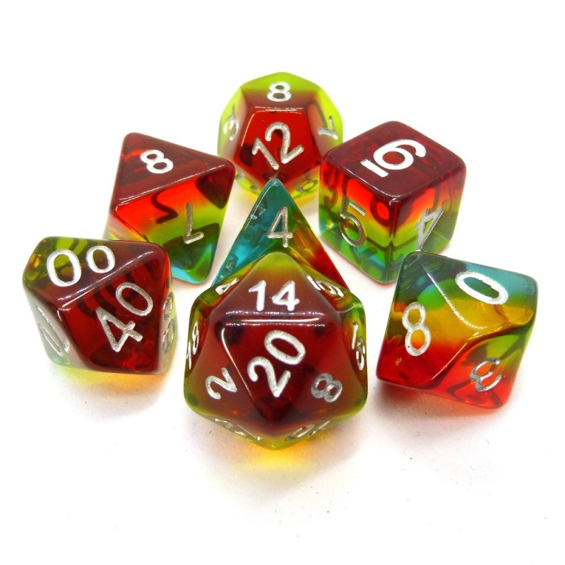 I dadi Aurora hanno una colorazione a fasce su dadi trasparenti che, contrariamente al solito, non si mischiano ma si alternano creando così un effetto ordinato e vario.