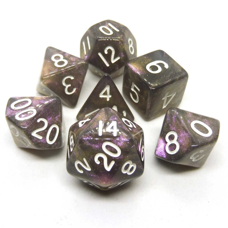 I Set di dadi Stardust sono dadi dai riflessi brillanti e multicolori. I dadi sono realizzati in resina e hanno una dimensione di 16 mm.