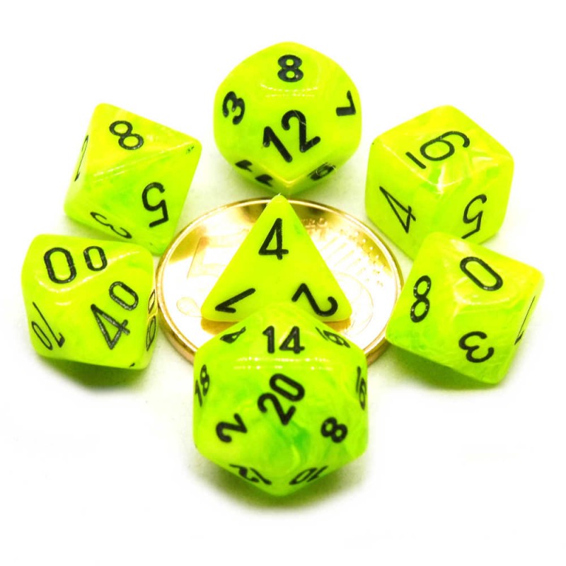 Set di dadi poliedrici mini. I dadi misurano circa 12 mm contro i 16 mm dei dadi standard.