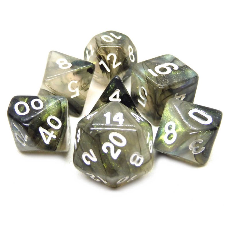 Set di dadi Mistici sono set di dadi dall'aspetto marmorizzato, con sfumature di due o più colori mescolate tra loro.