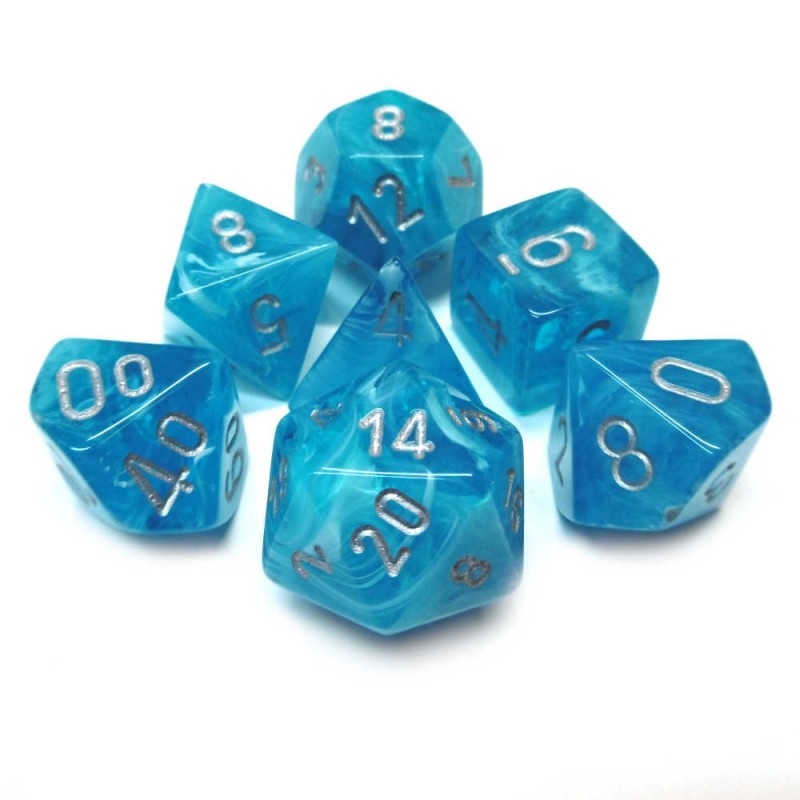 Set di dadi della serie Cirrus. Dado di color Azzurro acqua con incisioni dei numeri a colorazione argento.