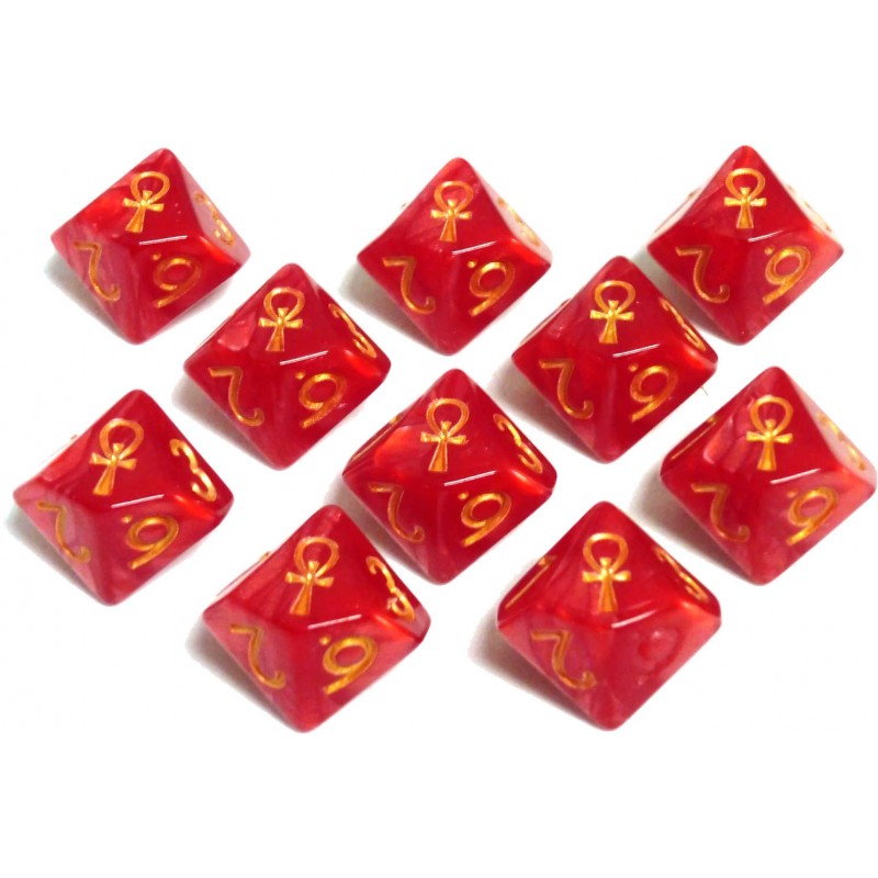 Set di 10 dadi a 10 facce verde perlati con numeri in rosso e design ispirato ai Vampiri con il simbolo dell'Ankh al posto del numero 1.